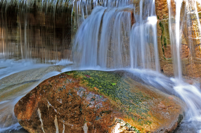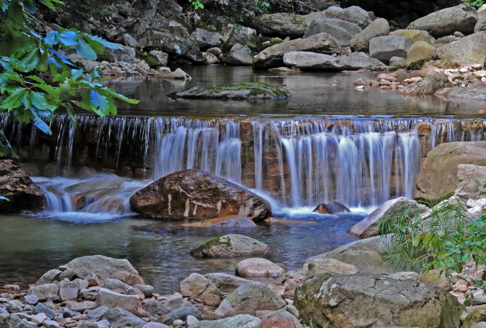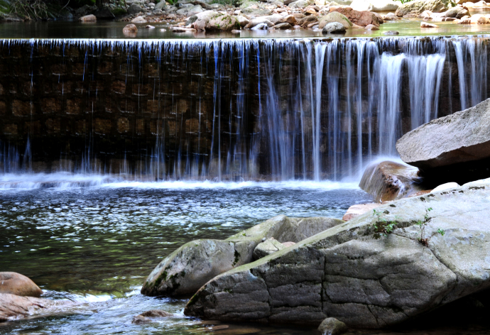 十八灣最精彩的景觀當屬龍?zhí)稙沉?。龍?zhí)短睹娉侍易有螤?,潭中為巨型石幫石底,上流之水從峽谷石縫涌注桃蒂,在潭中旋轉(zhuǎn)片刻,然后自桃尖瀉出,早年稱潭深莫測,現(xiàn)今經(jīng)過人工儀器測出,潭水深8.2米,潭面60多平方米,積水近500立方米;潭水碧綠,清澈見底,晴天有雙月映出奇觀,據(jù)說衛(wèi)星空中曾見到此地有一股紫氣沖天,乃吉祥之兆;潭水甘冽異常,含有多種元素,人飲用益處頗多,用于烹茶,芳香可口。東西兩側(cè)層巖疊障,高15米以上,好似兩門相對,掩護深潭,十分壯觀。